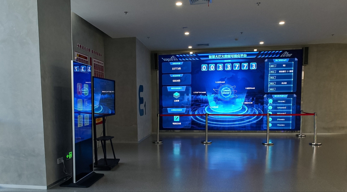 展示数据:显示实时排队进度、中心各部门上岗情况、各部门排队等候人数、排队等候平均时长、平均服务时间、各时间段排队人流量走势图、评价满意率的展示。